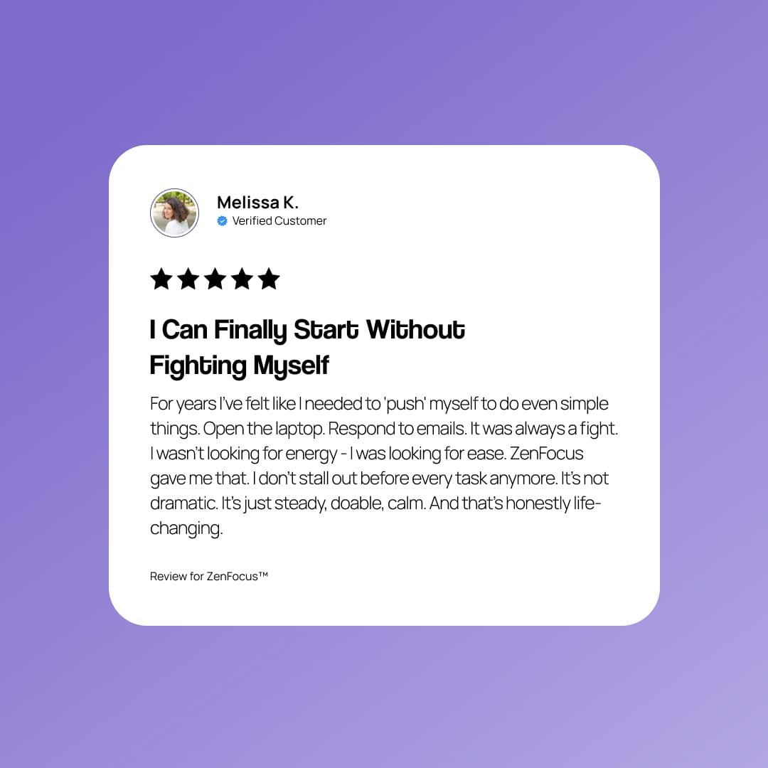 For years I’ve felt like I needed to ‘push’ myself to do even simple things. Open the laptop. Respond to emails. It was always a fight. I wasn’t looking for energy — I was looking for ease. ZenFocus gave me that. I don’t stall out before every task anymore. It’s not dramatic. It’s just steady, doable, calm. And that’s honestly life-changing.